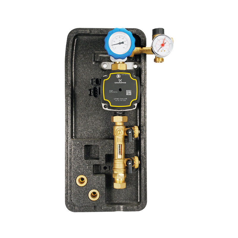 Das Modul ist serienmäßig mit einem Grundfos UPM3 Solar ErP-Ready Umwälzpumpen ausgestattet, einstellbar auf konstante Kennlinie oder PWM. Auf Anfrage können auch andere Pumpen mit abweichenden hydraulischen Eigenschaften oder höherer Energieeffizienz geliefert werden.