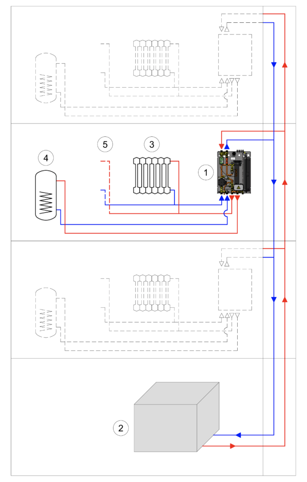 Dank dieser Module wird das Wärmeträgerfluid gleichmäßig von der Heizzentrale des Gebäudes direkt in jede einzelne Wohnung verteilt, je nach Bedarf. So wird die Wassererwärmung effizient und zuverlässig gesteuert.