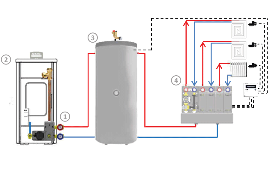 Ensuring proper preheating and a correct return temperature to the generator always guarantees a significantly higher performance and lifespan of the generator. NOVAMAT becomes crucial in the case of circuits paired with thermal storage, as the constant low return temperature could irreparably damage the primary heat exchanger.