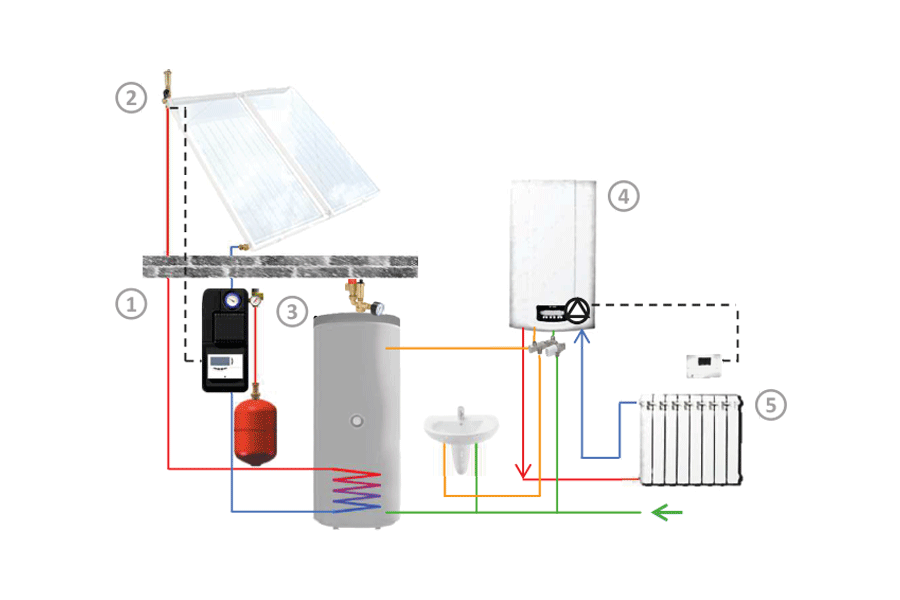 The group includes the system shut-off valve with thermometer and non-return valve. It is possible to exclude the non-return valve in case of system mainteinance. There is a safety group with a safety valve suitable for solar systems, a connection for the expansion vessel and a system pressure gauge.