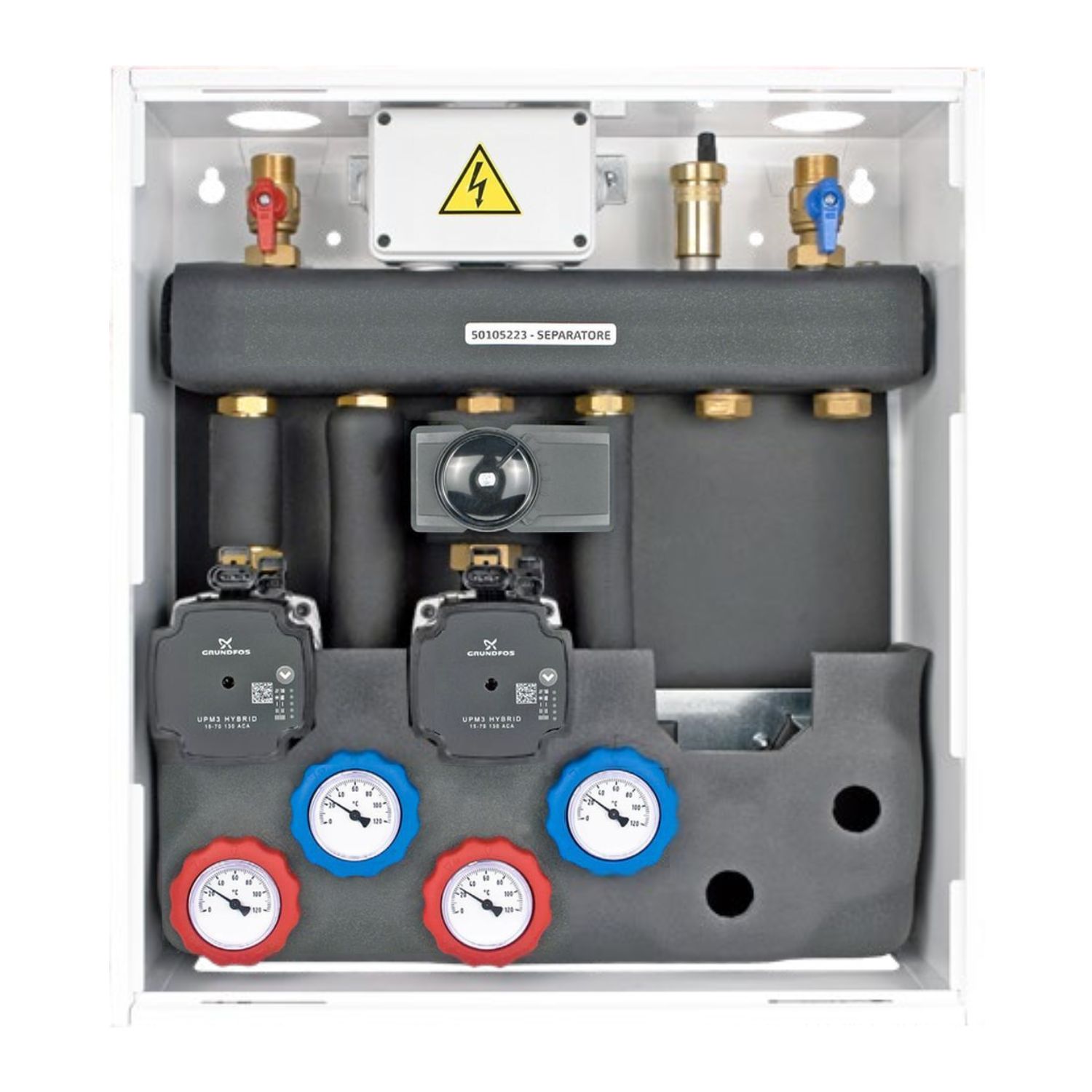 The NOVAZONE HEAT PUMP module is designed as a hydraulic complement to be paired with heat pumps. This module ensures the correct flow rate of the carrier fluid and adequate head pressure in all heating systems. An integrated hydraulic manifold is included within this module.