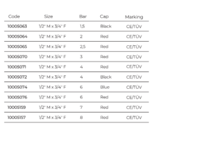 HomeBrass componentssafety componentsSAFETY VALVE SERIES 5000 SAFETY VALVE SERIES 5000 1/2″ M x 3/4″ F Temperature range: -20 ÷ 110°C Available pressures*: 1,5 -2 – 2,5 – 3 – 4 – 6 – 7 – 8 – 10 bar Heating Marking: CE, TÜV Versions The product Accessories Download the technical data sheet Request information Categories: Brass components, safety components Product ID: 19185 Versions 1/2″ M x 3/4″ F 3 bar Cod. 10005070 Scarica il catalogo Il prodotto Description THE PRODUCT